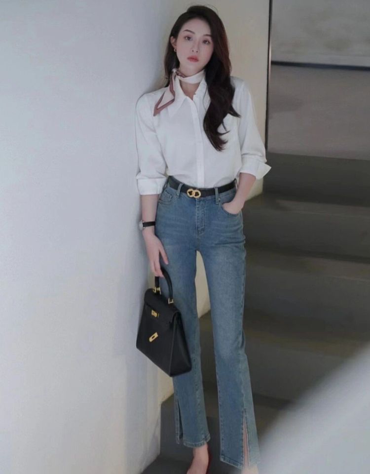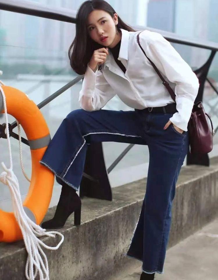 由于喇叭牛仔裤本身时尚感较强,所以在搭配上可以采用混搭方式,上半身搭配白衬衫,再加上丝巾、包包装饰,“半正式半休闲”职场也能驾驭。