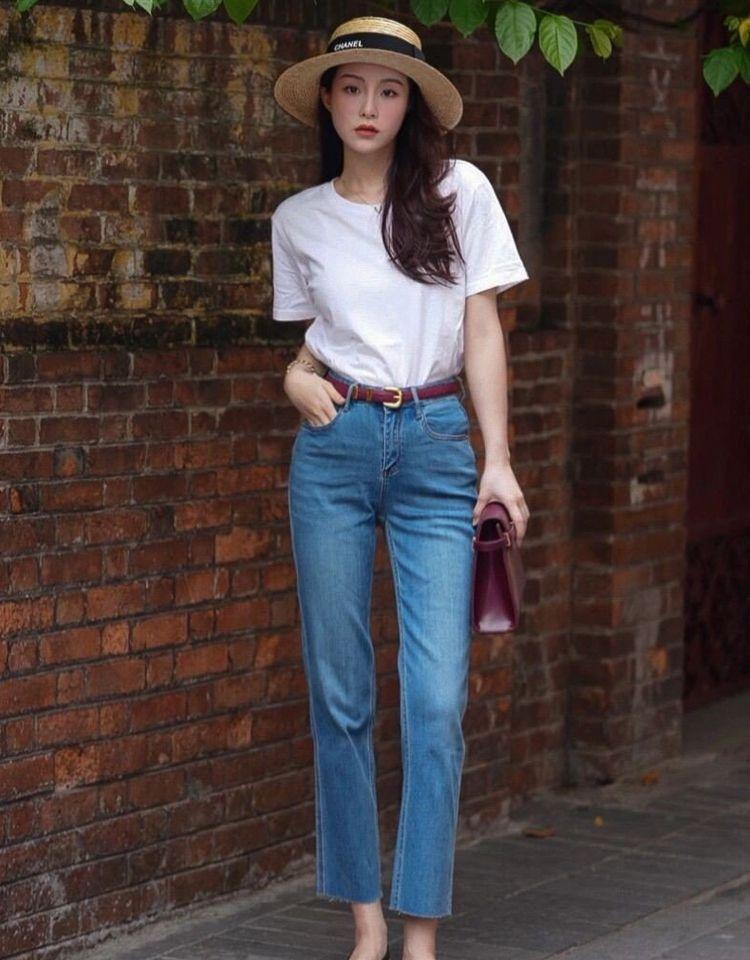 在搭配上尽量“从简”,发挥九分牛仔裤的大优势,上面搭配纯色系T恤,整体造型干练又利落,再利用“塞衣角”提高腰线位置,达到显高显瘦的目的。