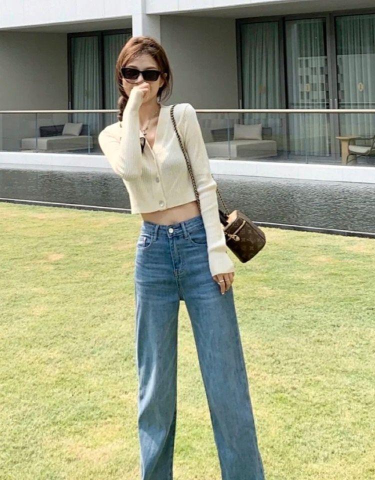 为了大化的发挥阔腿牛仔裤的特点和优势,建议上半身搭配露脐装,通过露出腰线视觉上拉长整体身材比例,略带性感又显身材!