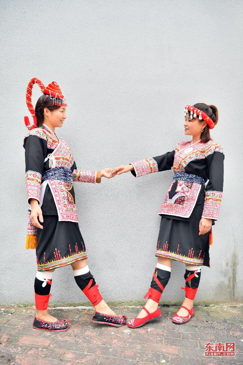 着传统的畲服+穿戴便捷的现代头饰,是年轻畲女喜欢的装扮。