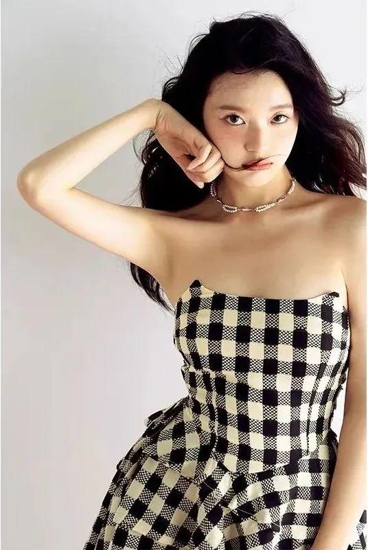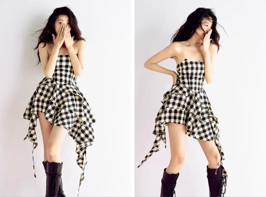 ⑪ 新款的格子抹胸裙也不错,延续了她平时总爱做得不规则下摆,显得腿更长。