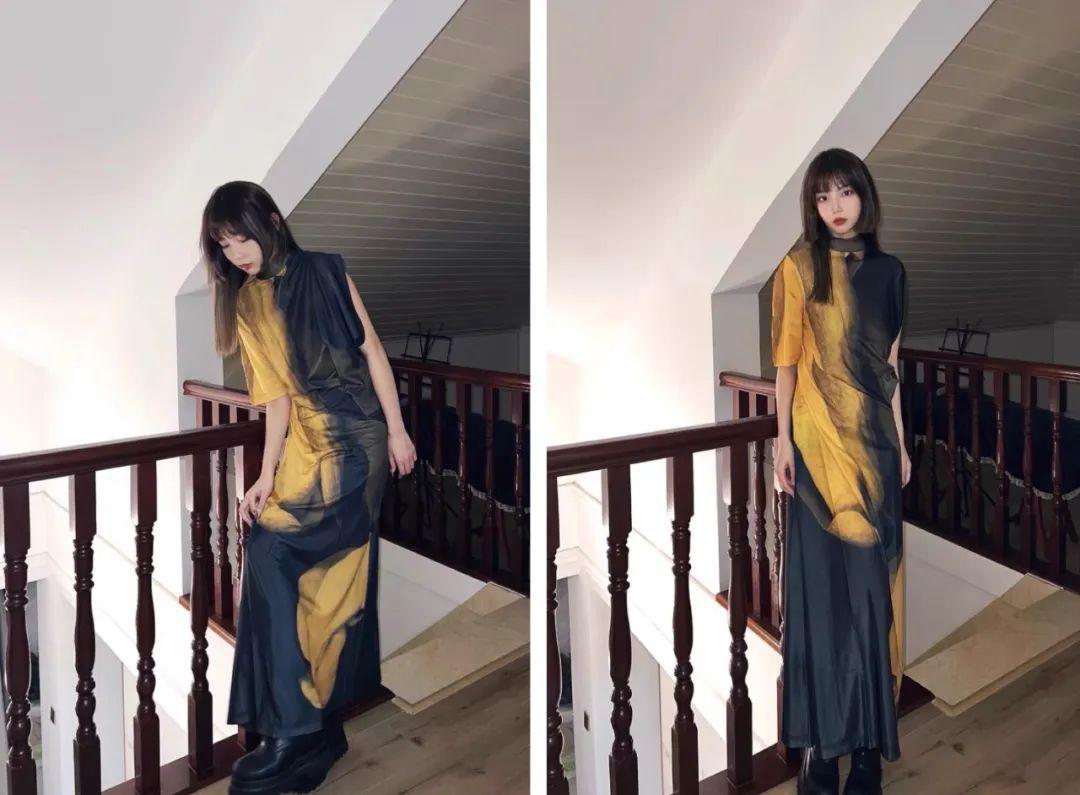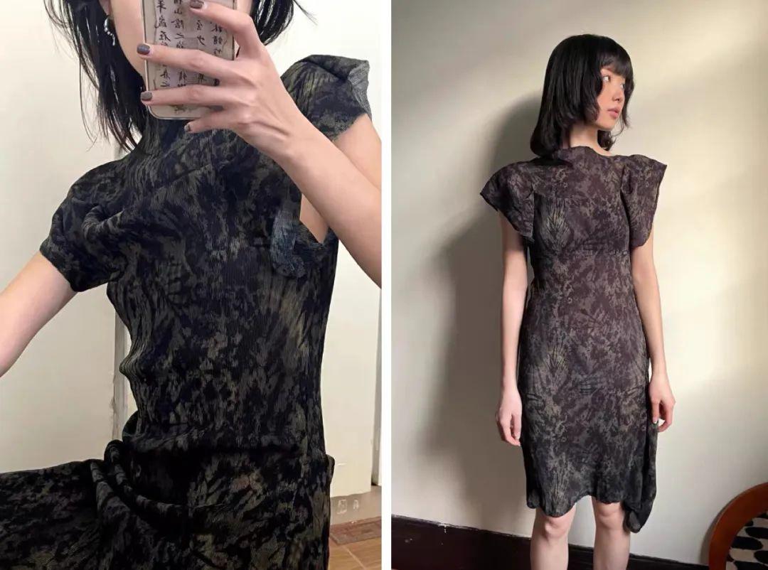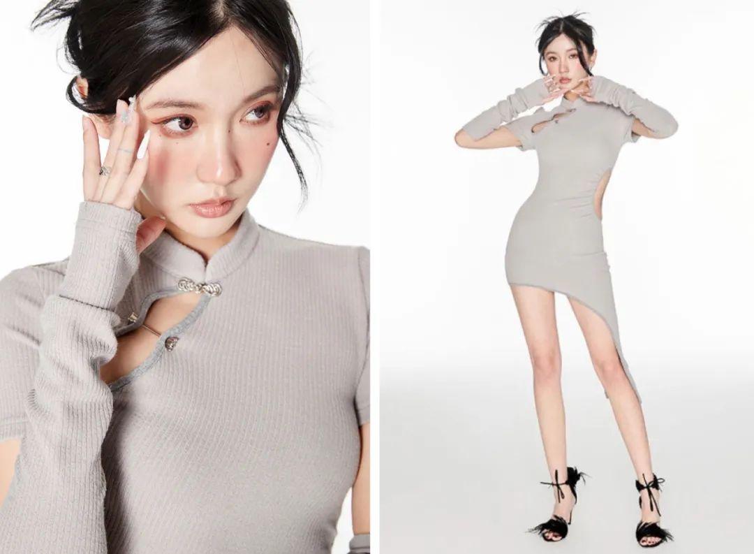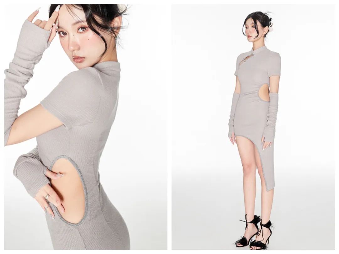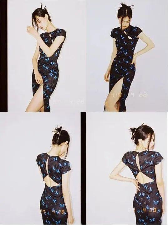 针织面料+不对称的下摆还有腰部挖空的,更显腰细。加了套袖的设计都会比传统旗袍更多了一些时髦感驾驭难度也低了一些。