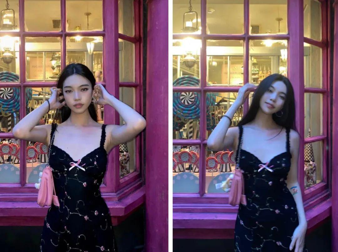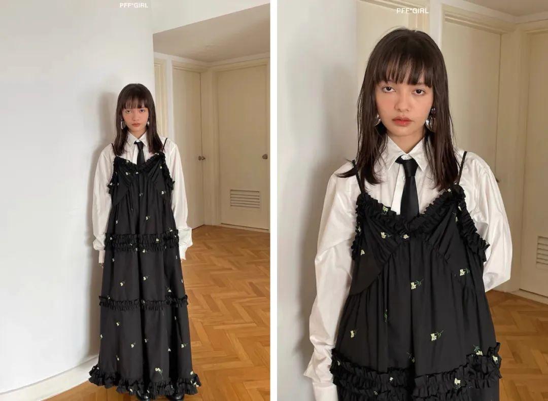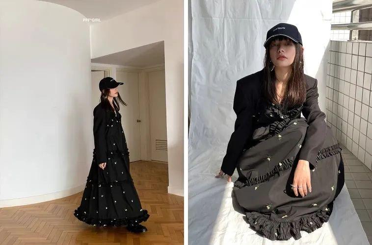 ㉔ 日系乖乖女风的连衣裙她家也有,黑色吊带+小碎花的设计,和西装棒球帽搭配甜中带酷,小个子女生也可以驾驭。
