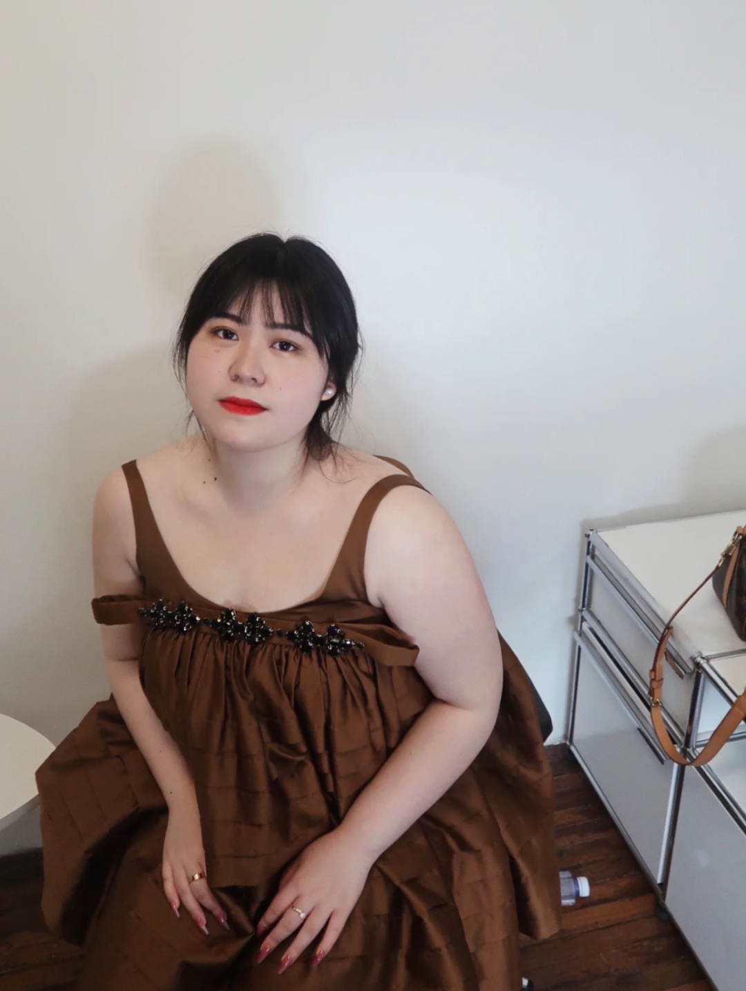 这件裙子用了三种不同面料拼接,上身胖的位置有相对硬挺的Tr面料做出肩线减少圆滚滚的感觉。