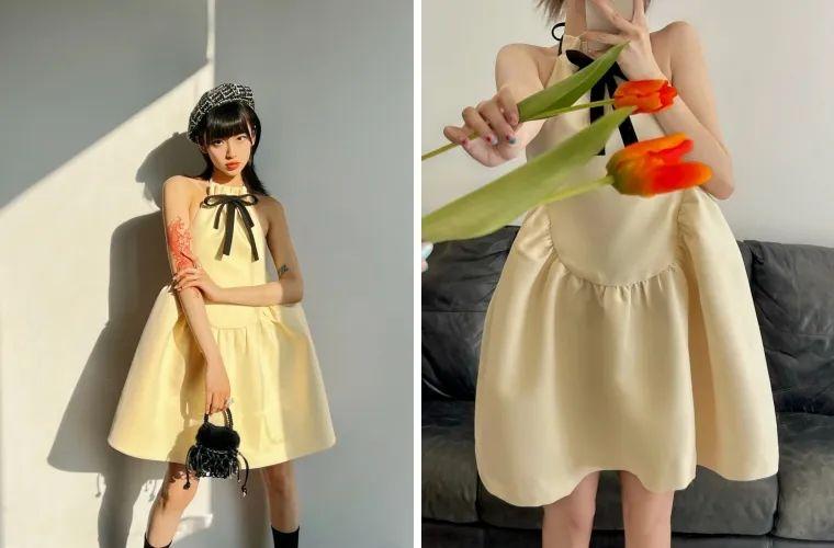 ㉚ 喜欢软妹一点的,这个大翻领的鹅黄连衣裙也不错。
