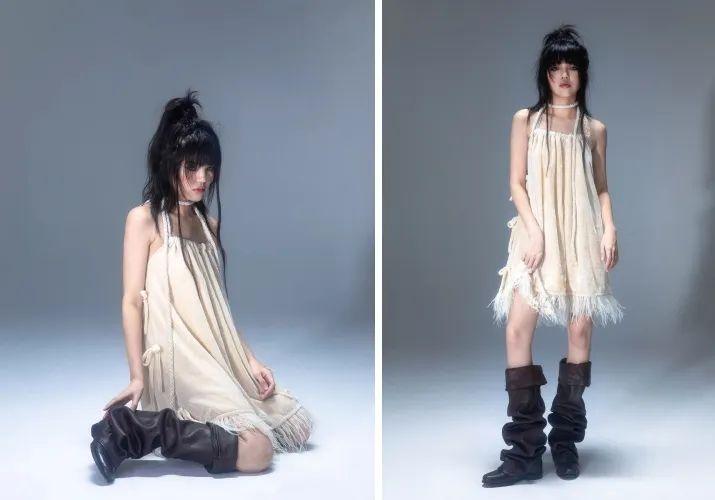 ㊽ 粗麻绳的挂脖吊带裙,加上羽毛裙摆也太特别了。