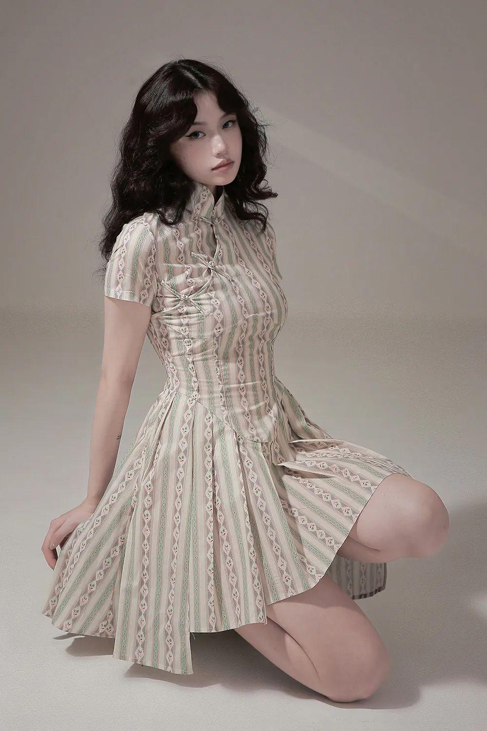 跟传统旗袍相比,胸前盘扣的位置做了小镂空的设计,增加了时髦感也不易太暴露。