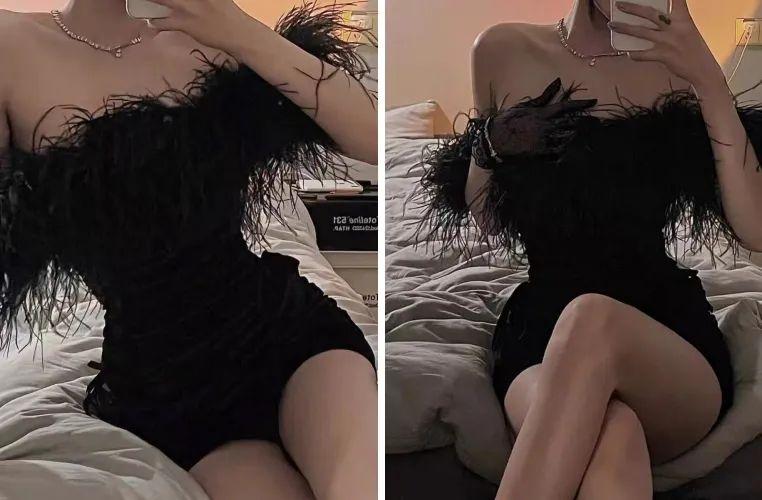 ㊾ 鸵鸟毛一字肩包臀裙,正式场合和约会的绝杀小裙子了。