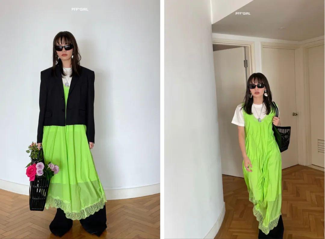 ㉓ 觉得荧光色难穿的姐妹看这,只要和纯黑纯白搭配一准相得益彰。