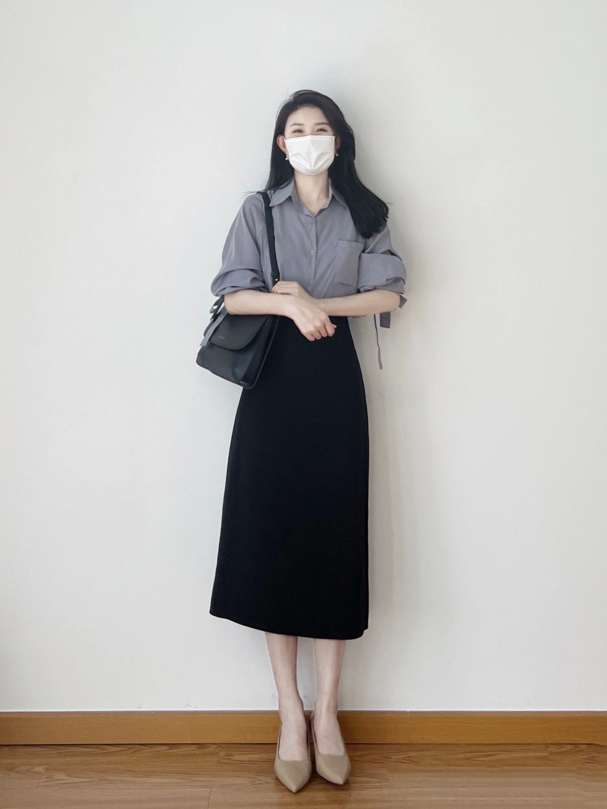 这身灰色衬衫配上白色高腰直筒裙的造型,上下身运用到的单品都很宽松,有利于修饰胯宽以及腰粗等问题,上配上一双驼色尖头高跟鞋,优雅又有女人味。