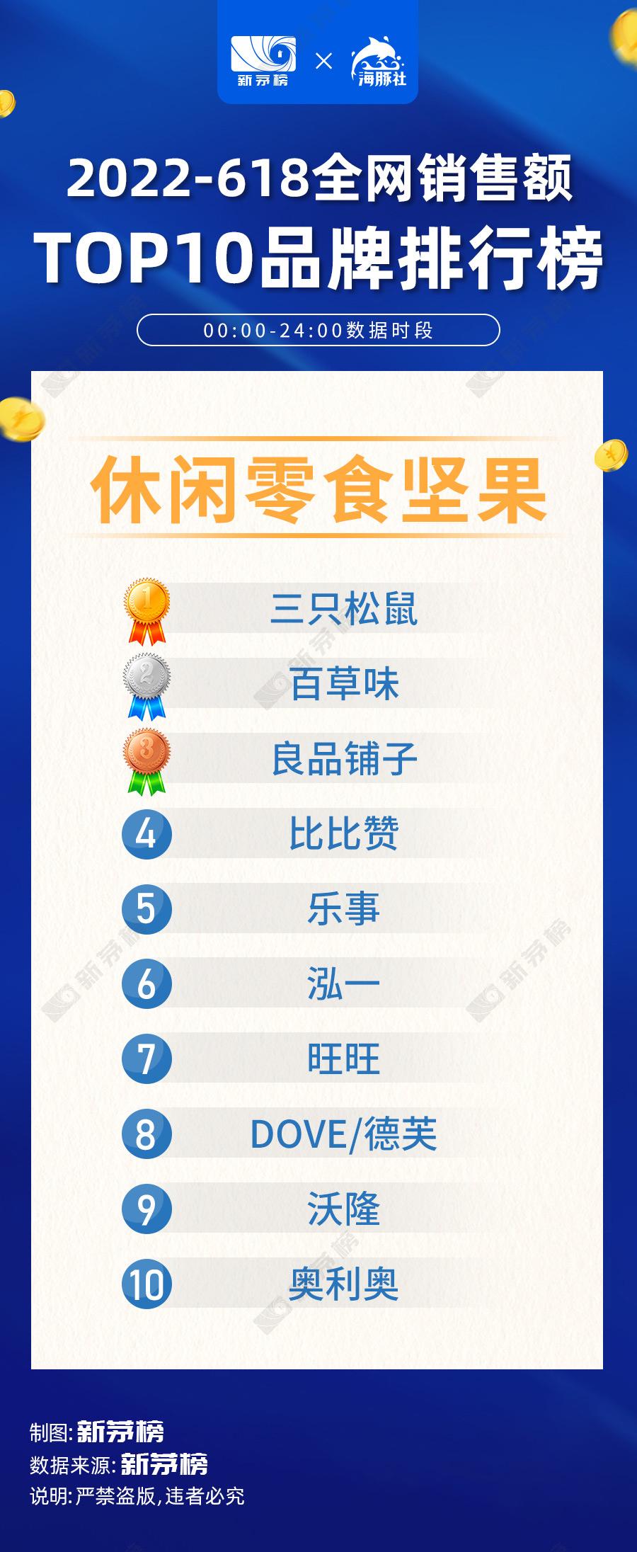 在休闲零食赛道当中,两大新国货品牌位居前三,分别是三只松鼠与良品铺子。三只松鼠2021年营收97.7亿元,同比下滑0.25%,位列2021新茅·品牌百强榜第10;良品铺子2021年营收93.2亿元,同比增速18%,为了2021新茅·品牌百强榜第11。