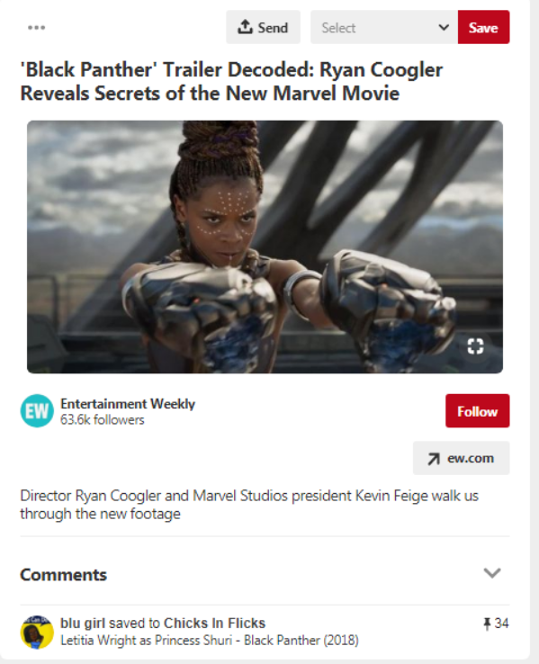 在很多美国人心目中,《黑豹》(Black Panther)是有史以来伟大的漫威电影之一。Pinterest有关电影中的国度瓦坎达(Wakanda)特色服装灵感的搜索量同比上升了504%。其中引人注目的是,人们越来越多地分享电影中苏睿公主(Princess Shuri)的图片,电影中的她以无可挑剔的智慧、风格和妆容征服了人们的心。