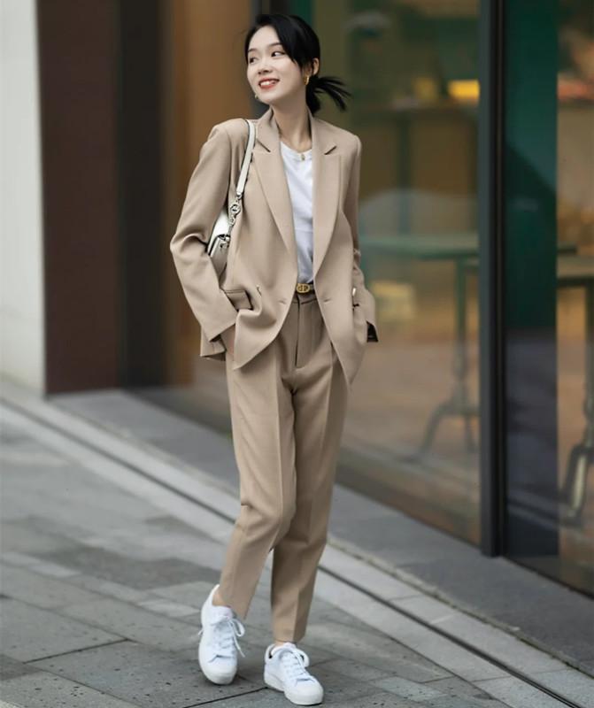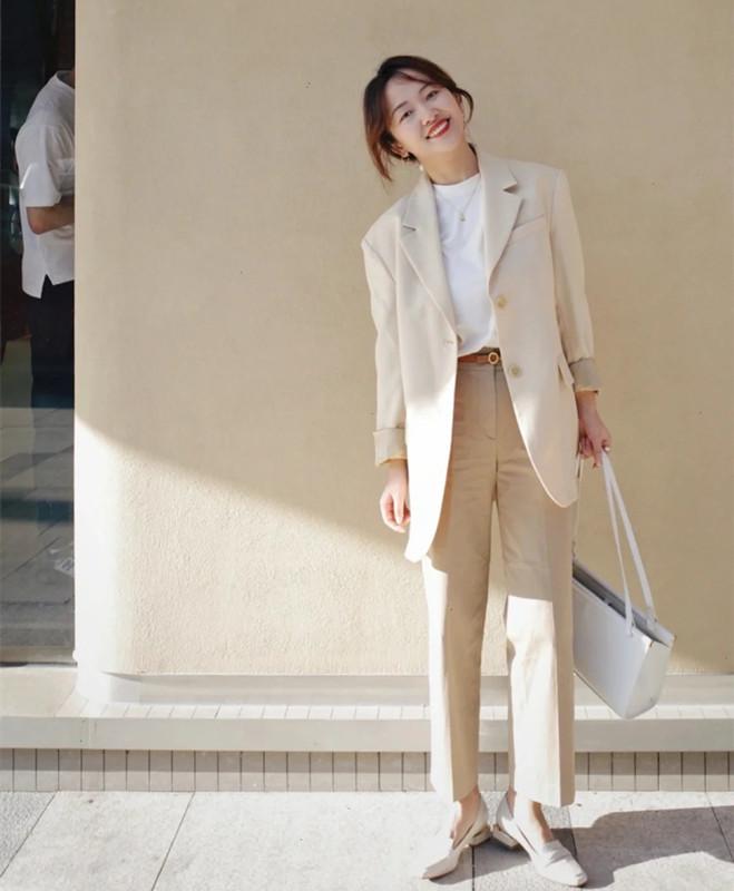 什么配色方案既好搭配又好驾驭?答案当然是同色系。米色西装和同色系的西装裤组合在一起,能轻松展现出温润如玉、端庄沉稳、知性优雅的成熟女性气息,使得中年女人摆脱沉闷刻板、装嫩做作的情况。米色西装+卡其色西装裤,两者都是色调柔和且大气的颜色,耐看又舒适,没有给人视觉刺激感。