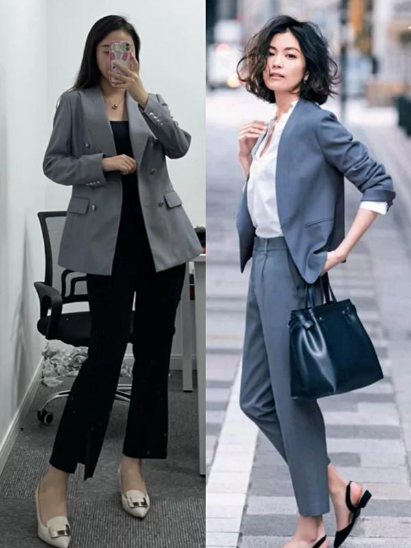 黑色T恤+小黑裤+灰色西装,在黑色服装的对比下,灰色西装就属于深浅结合中的“浅色”,让彼此之间的色彩层次感透过服装展现出来。既体现出造型的清冷感,又避免黑色过多导致沉闷。灰色西装+灰色西装裤+白衬衫,也属于深浅结合的配色方式,将灰色潜在的枯燥和清冷冲散,转而多了几分优雅与大气。
