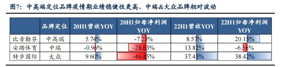 例如,对于同为运动服饰赛道、不同定位的比音勒芬(002832.SZ),结合2020H1和2022H两轮疫情较为严重时期的业绩表现来看,其表现为稳健,2020上半年营收维持增长、净利仅小幅下滑,2022上半年营收净利均保持增长、受疫情扰动较小;特步在2020上半年期间由于补贴经销商净利下滑较多、但 2022表现突出。