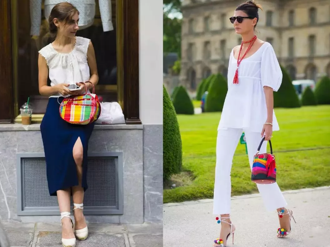 如果穿了一身素净的白色,或者一身比较沉闷的黑色,那么就可以利用小面积的彩色点缀一下,会增加穿衣氛围的活泼感,可以选择彩色的包包、首饰,或者鞋子修饰,值得尝试。