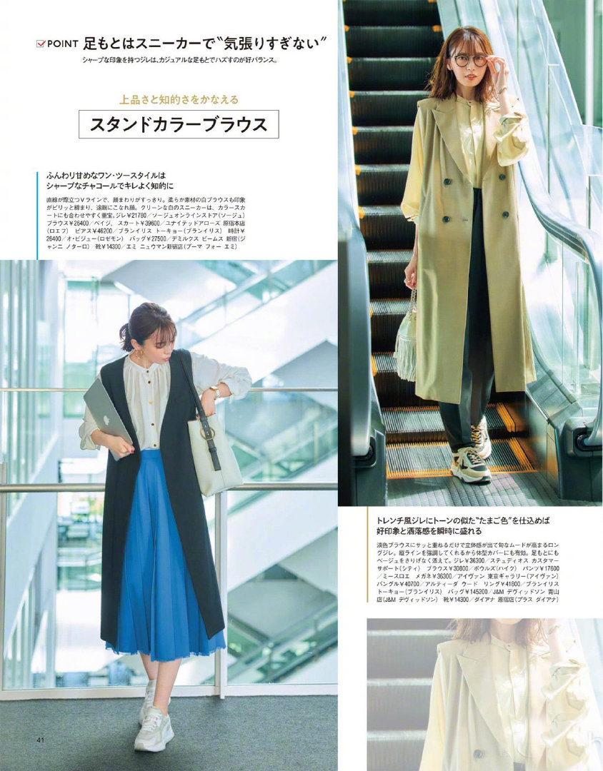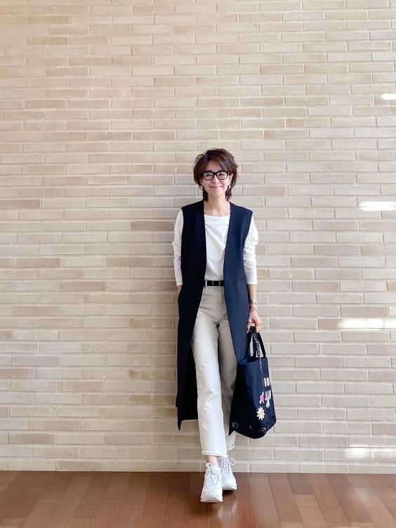 白色长袖搭配黑色无领马甲,和谐的色调给人优雅知性的感觉。脚踩一双运动鞋,一身利落线条再给人干练精致的帅气。