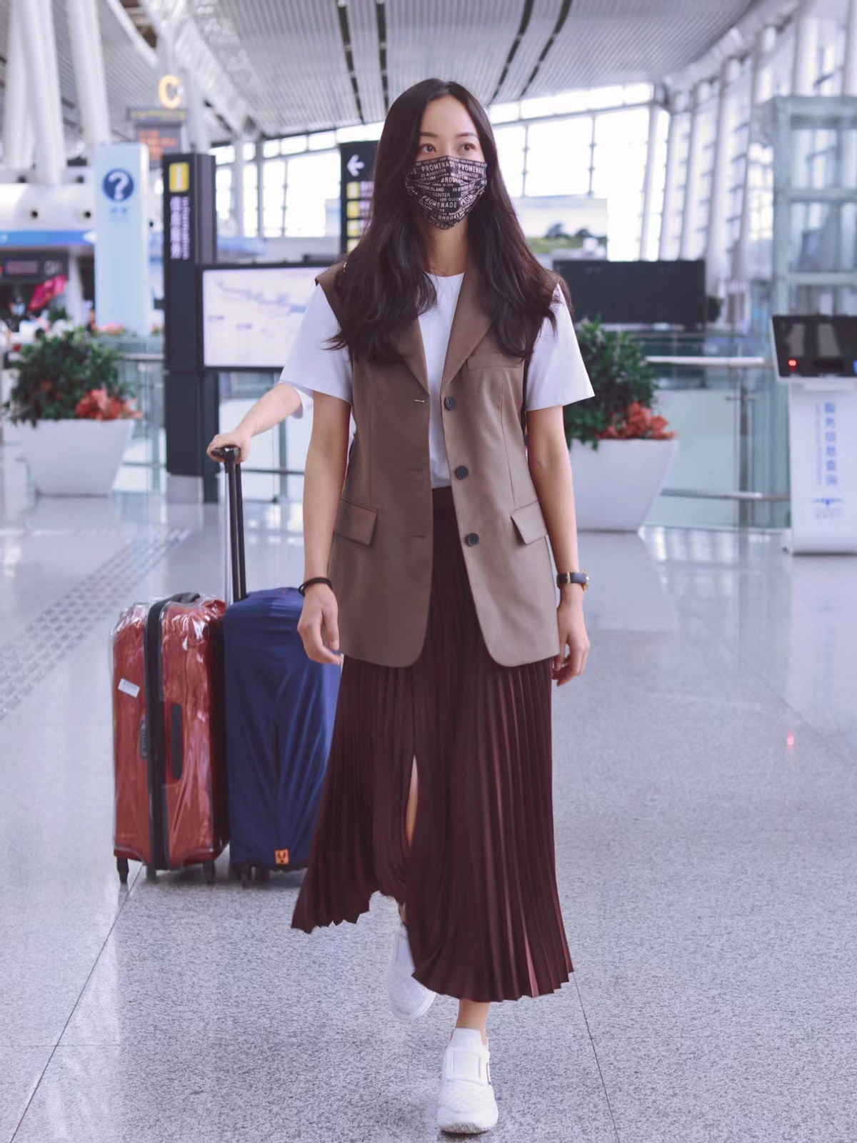 长款的西装马甲是叠穿的利器。这套装扮中,黑色打底衫如果只搭配棕色的伞裙,就会平平无奇,而且颜色也很沉闷。但当她用一件深棕色的西装马甲作为外搭,造型就立马有了层次感,走起路来都带风,简直飒爽英姿!