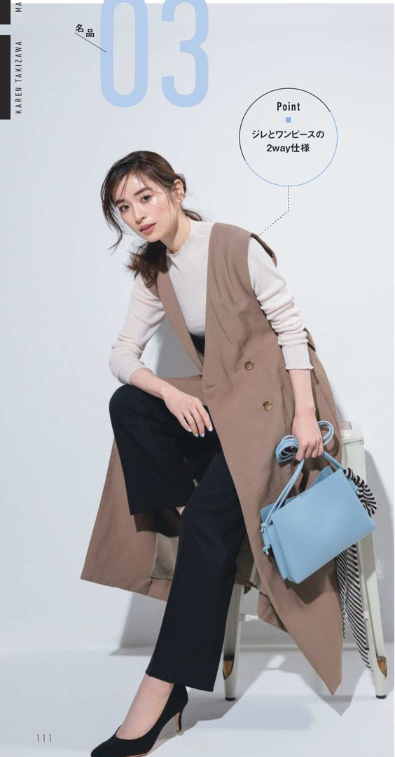 卡其色马甲有种天然的职业感,和西装裤、浅口高跟鞋是天作之合,加上经典的双排扣,基础修身的版型,穿搭简单方便不挑人。雾霾蓝的包包是点睛之笔,为大地色系的稳重增添了一丝活跃感。