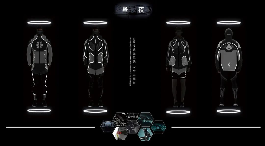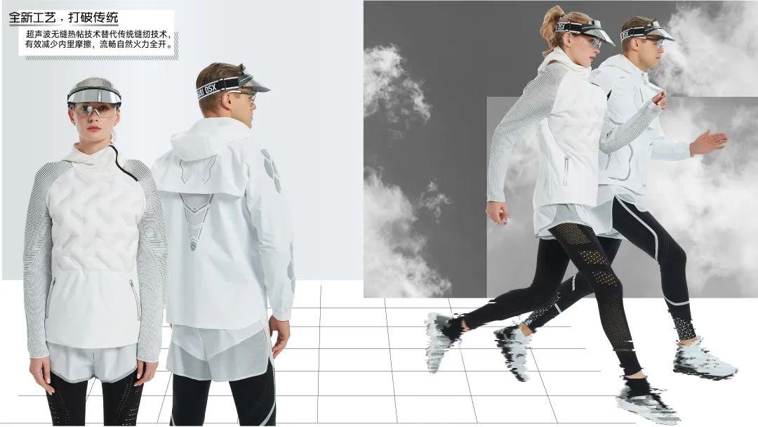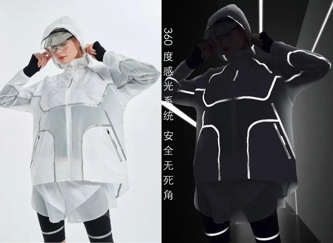 为了防止跑步期间服装接缝对跑者皮肤长期摩擦造成损伤,整套衣服采用超声波无缝热贴工艺,服装还为夜跑跑者打造了夜间360度感光系统,为夜跑跑者保驾护航,做到无死角,以上都体现了产品以人为本的设计理念与人文关怀性。