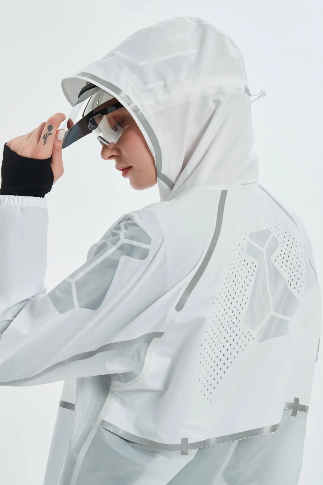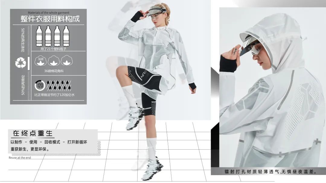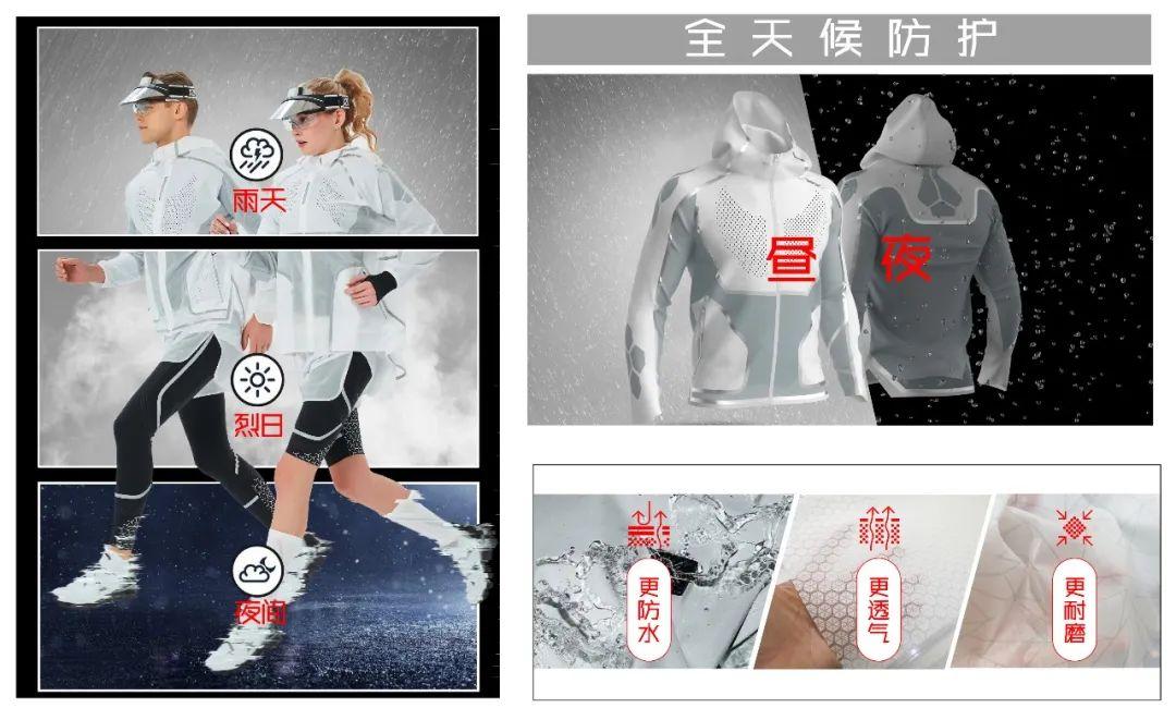 作品通过升级制作工艺,融合多种不同类型的材料科技,改良强化运动性能,为跑者提供了出色的全天候功能解决方案。主要体现在整件衣服薄如蝉衣,轻质便携,极大减轻了跑者跑步期间的负重感。