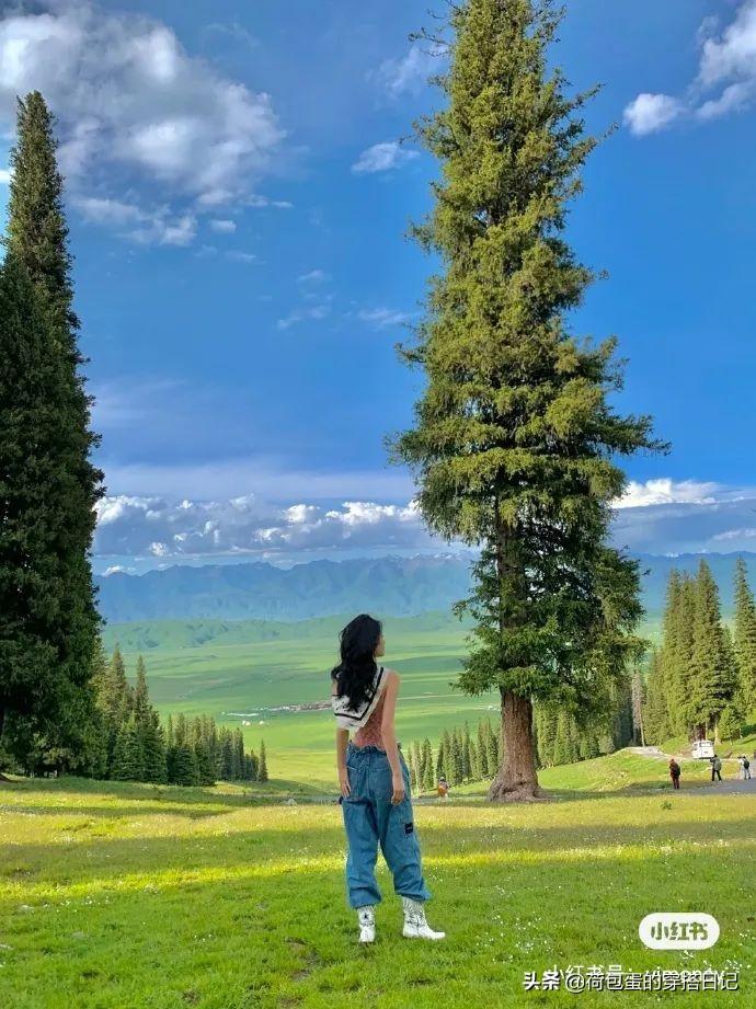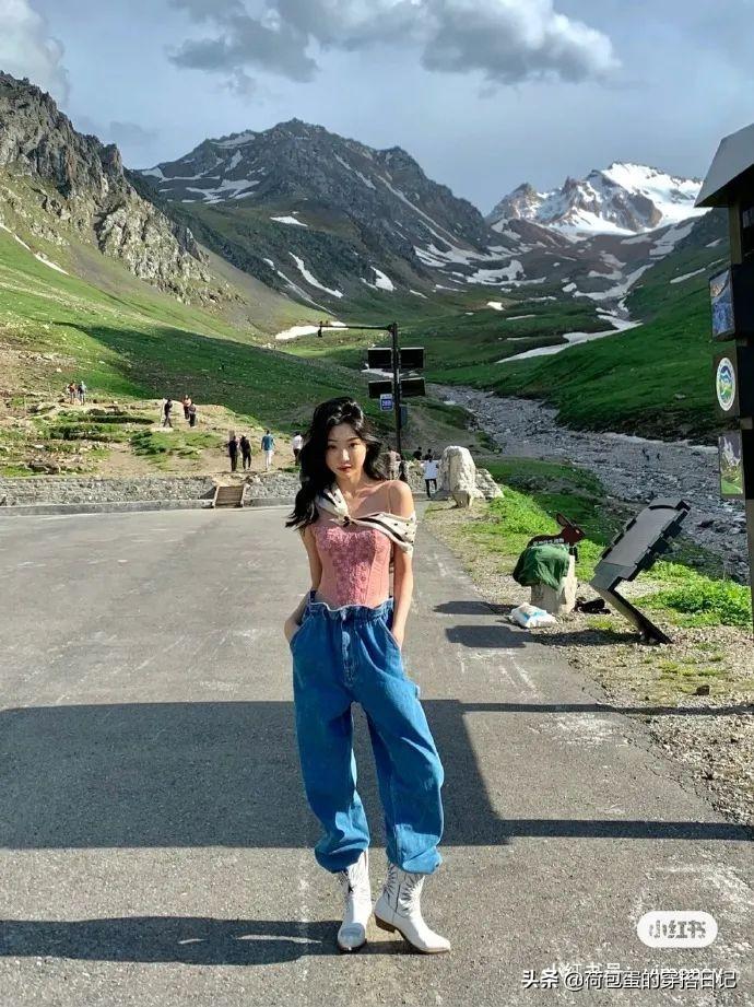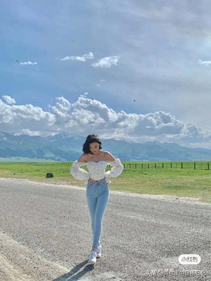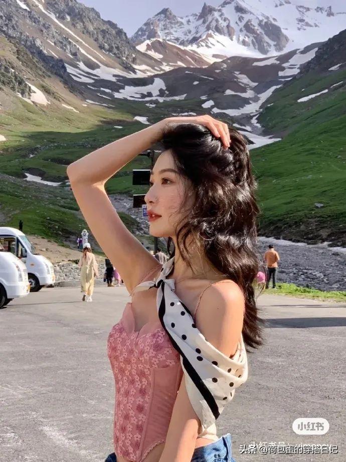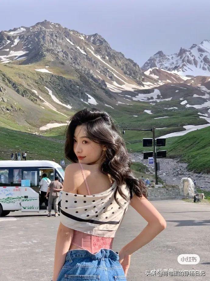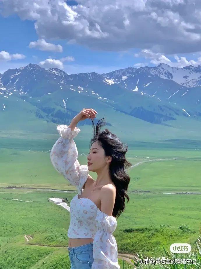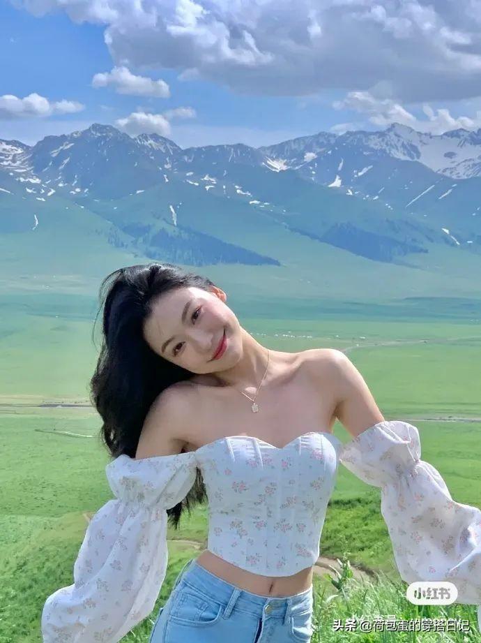 易梦玲在新疆拍摄的第 N 套写真,背景的蓝天白云雪山草原有童话氛围,以及易梦玲还说新疆近每天 11 点才落日,十分种草去新疆旅游鸭~她上身的这件泡泡袖上衣可以说是把泡泡袖元素用到了仿佛充了气,而且一般女孩穿泡泡袖是为了遮拜拜肉,易梦玲偏不,她的泡泡袖特意露出上臂前段和腋下部分,美女子就是如此的自信!又是一件 XIAO LI X 易梦玲联名系列款,大概是梦玲自己设计的小心机~