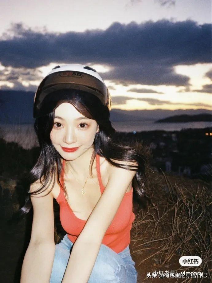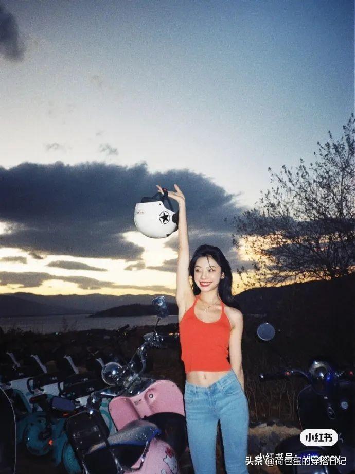 今年夏天在辣妹之间十分流行吊脖上衣,特别是对于有斜方肌以及肩颈线条不够的姐妹来说友好,易梦玲这件抓眼的红色吊脖上衣来自 & Other Stories,搭配婴儿蓝牛仔裤在胶片照片中也太复古了,是机车辣妹~