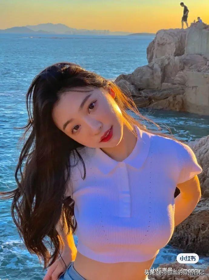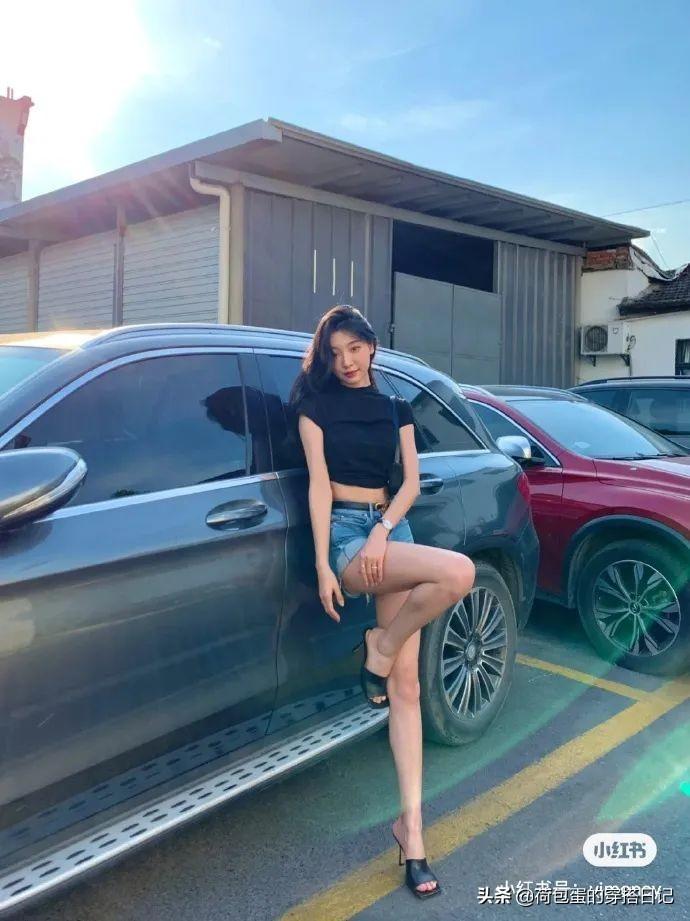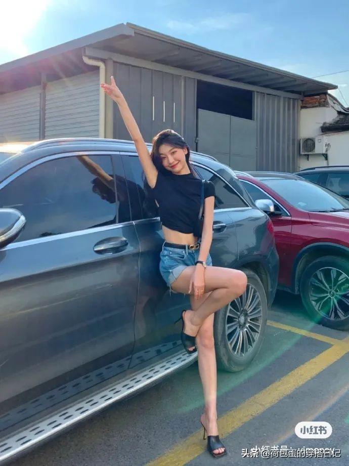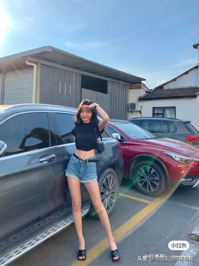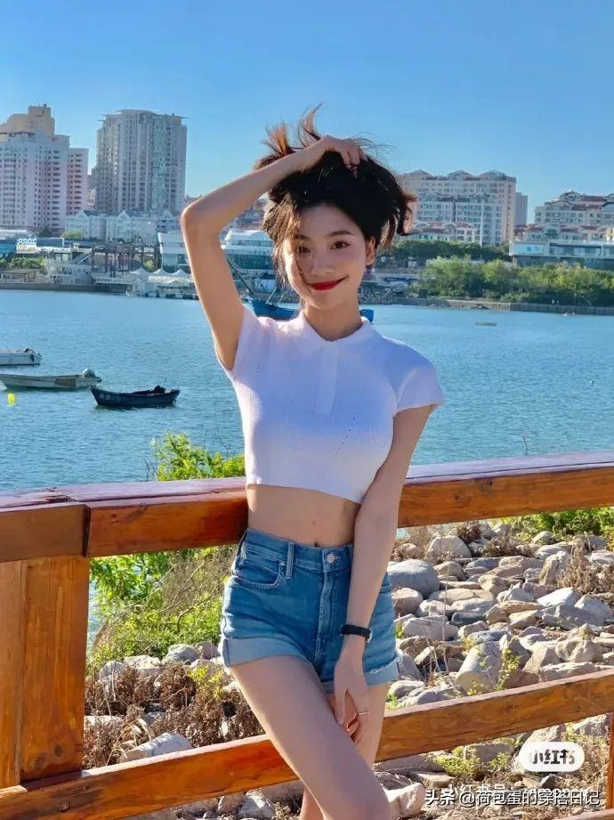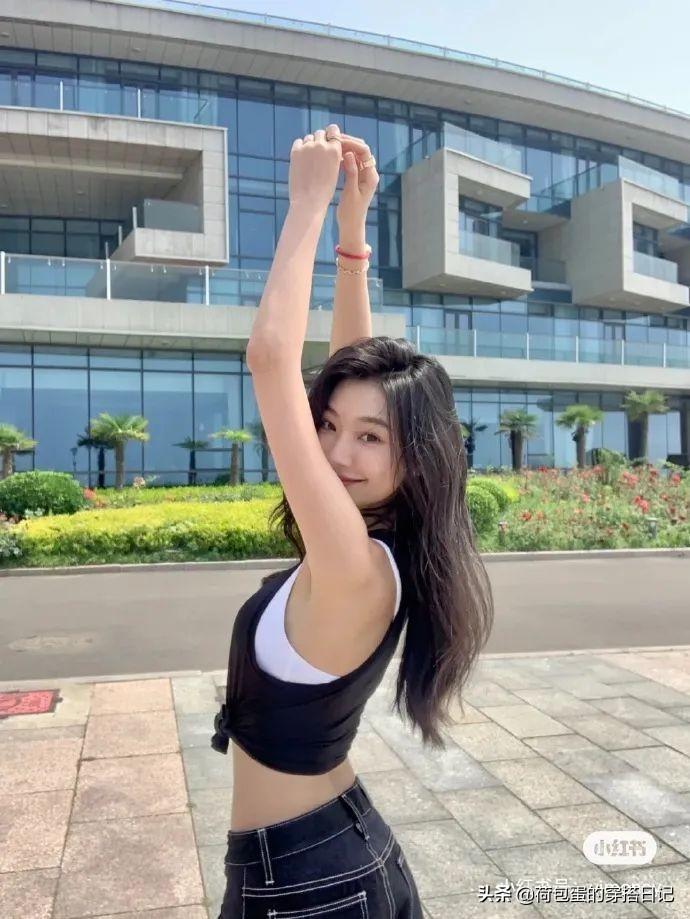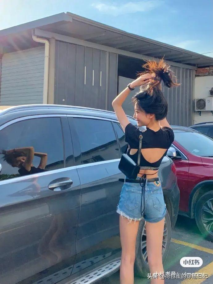 多看易梦玲的穿搭就能发现她的上衣挑选法则就是“万物皆可短”,比如穿 POLO 衫虽然领口扣到上面一颗,半身照看起来乖巧学院风,但仍然是一件修身露腰短上衣!仔细看易梦玲穿牛仔热裤竟然还需要用橡皮筋改小裤子腰围,美女子的腰也太细了吧!