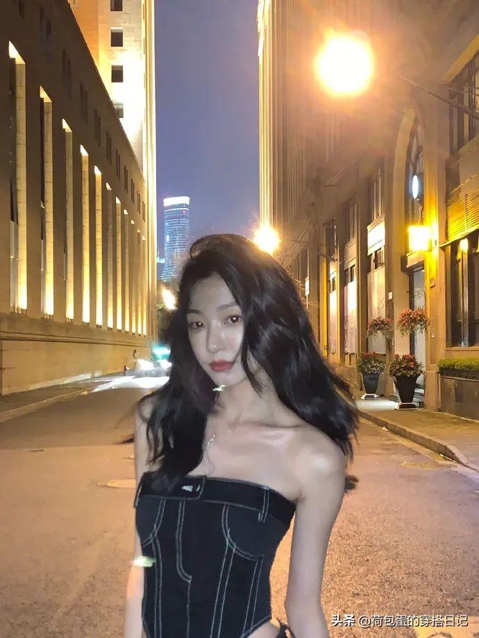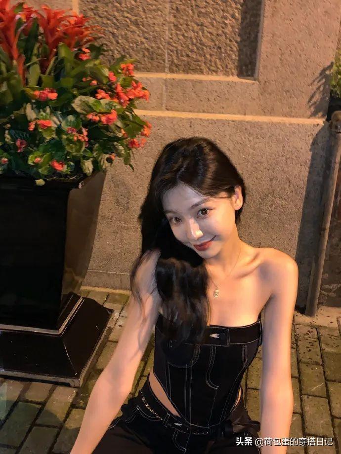 看多了纯欲风的易梦玲,暗黑辣妹风的易梦玲也带感啊~黑色牛仔抹胸来自澳大利亚设计师品牌 DION LEE,前卫先锋又带有结构主义色彩的设计是它的特点,易梦玲这件倒三角下摆的抹胸就很好地体现了这点。