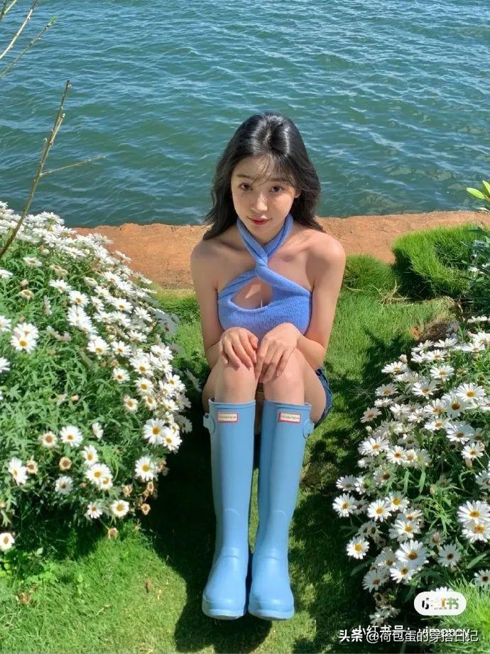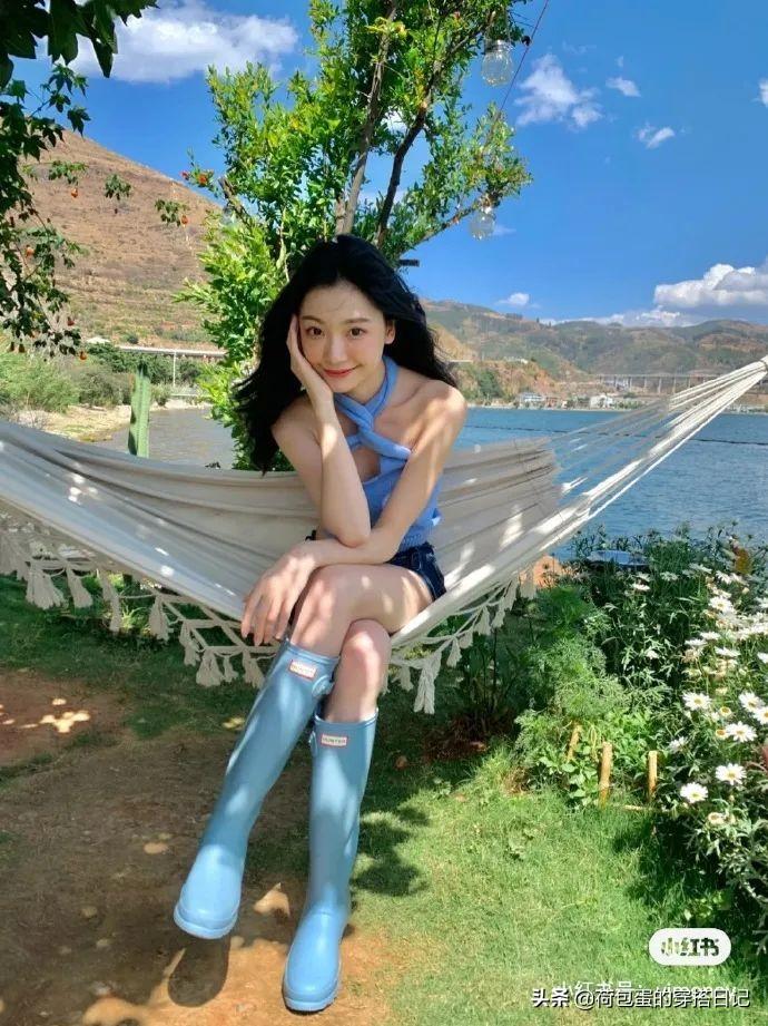 易梦玲的另一套吊脖上衣又是另一种风格,蓝色扭圈 musier 吊带调皮搞怪,搭配粉蓝色 Hunter 雨靴有一种二次元感,也十分清爽适合夏天,整体 Look 是真人芭比了~