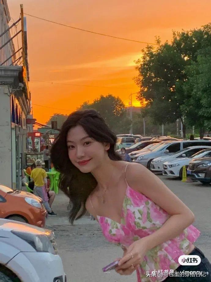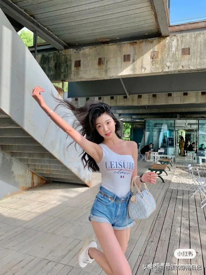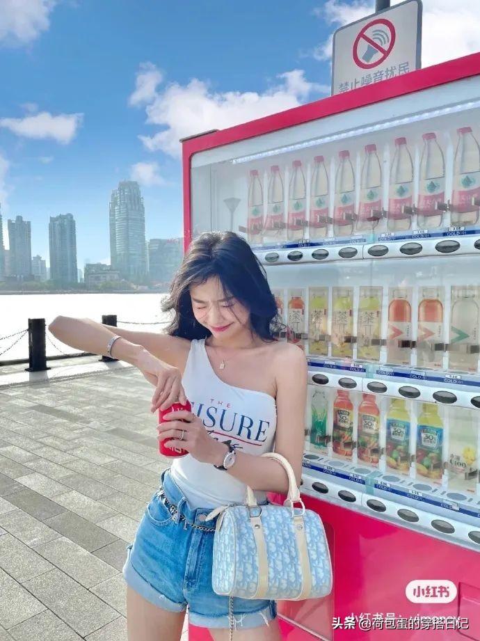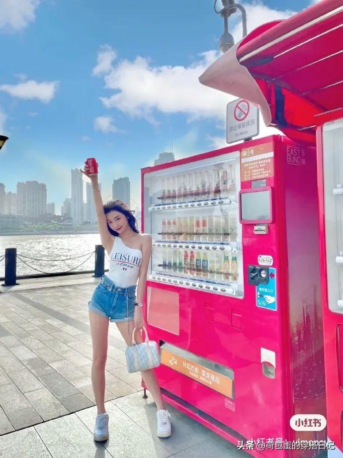 大概有 N 个网红博主教你在自动售货机前拍照了,梦玲找到的是农夫山泉专营的自动售货机,红色机身醒目抓眼,很适合拍夏日汽水写真!梦玲身上这件 Olastage 异形吊带大家估计都很眼熟,有点像宣美的一套很出圈的舞台造型,搭配牛仔热裤和小白鞋这样人手一件的百搭单品就很元气美少女,手上拎的中古 Dior 包包和整体穿搭也超配!