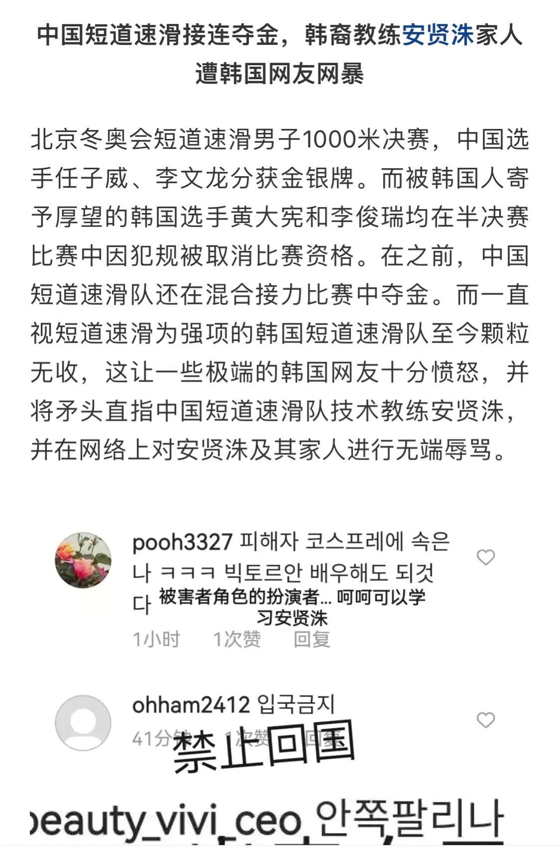 再就是,我国短道速滑的技术教练是韩裔俄罗斯籍的安贤洙,中国的胜利导致安贤洙及其在韩国的家人都遭到了韩国网民的网暴和攻击,使得安贤洙不得不出面进行解释和道歉。