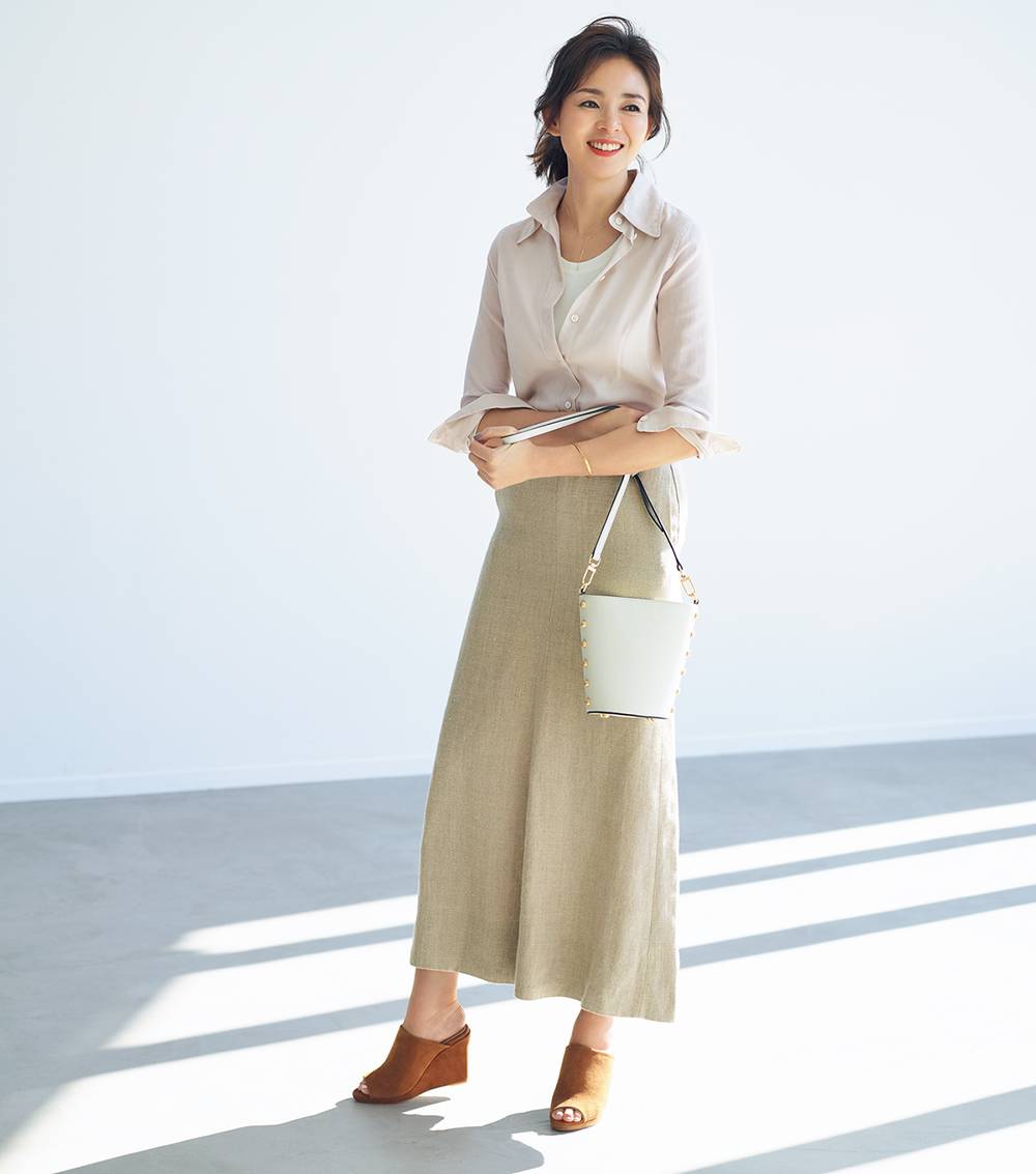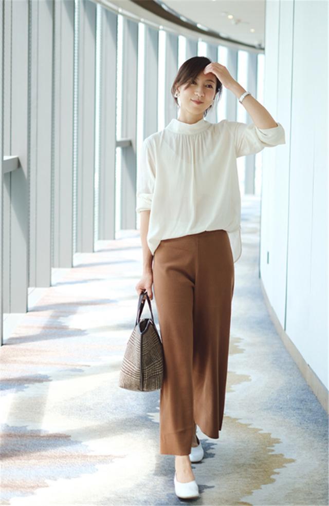落实到具体的搭配上,可以选择一件白色的圆领衬衫,圆领的造型让风格更加温柔知性,少了那种凌厉感,搭配一条棕色的阔腿裤,拥有极强垂感的面料对腿部可以起到很好的修饰作用,遮肉又显瘦,再配上一双白色的平底鞋,随性日常。