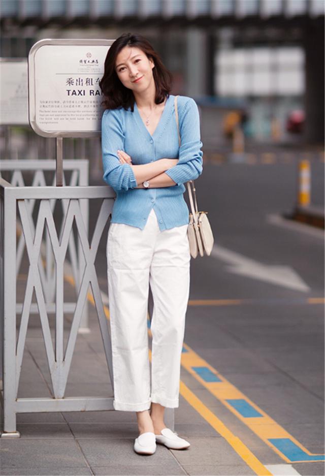 软糯的针织衫是入秋后必备的穿搭单品,对于女性而言也是很好的显气质利器,浅蓝色的款式穿在身上,养眼耐看,也能衬托肤色提升气色,让整个人看上去更加年轻有活力。下半身搭配一条白色的直筒裤,可以修饰腿部的线条,让身材的比例更加笔直修长,蓝色与白色的搭配是很时尚的配色组合,值得大家借鉴。