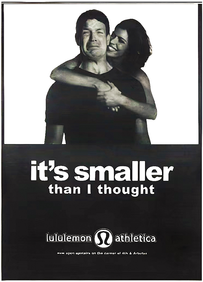 再比如,当时温哥华有个健身房围绕着性打擦边球做广告,他有个广告,上面有个女生的腿绕着这个健身房老板的头,上面标语写着“这比我想象中的大”。于是薯片哥也做了广告,他让他们的设计师抱着他的脖子,标语写着“比我想象中的小”。