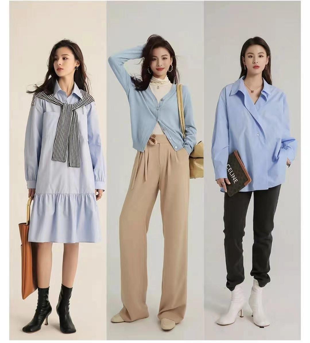 天空蓝衬衫领口设计独特,V领展现出漂亮锁骨,还显脖颈修长。宽松oversize版型遮肉果很不错,衬衫裙摆采用蛋糕裙款式设计,甜美又俏皮,裙摆让简约基础款加分。选择尝试针织衫与高腰裤的搭配组合,小个子这样穿也不错。
