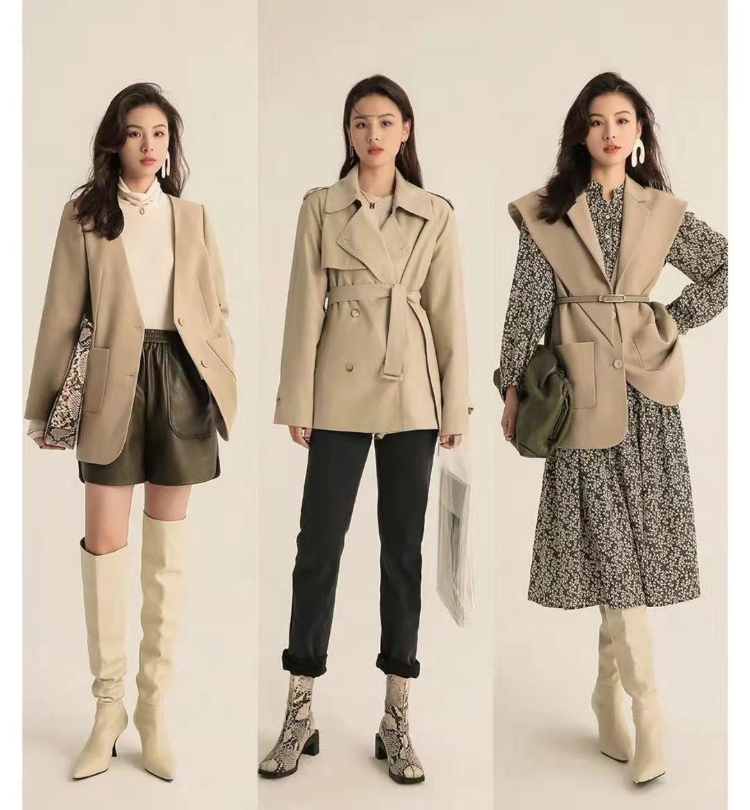 卡其色是时尚界的经典色系,与黑色搭配组合是知性女性标配,无西服领西服外套衣长略长,下半身穿着尽量修身显身材些,整体看起来协调舒适。比如选择长筒靴,修身休闲裤,及膝长筒靴御姐范儿太帅了。