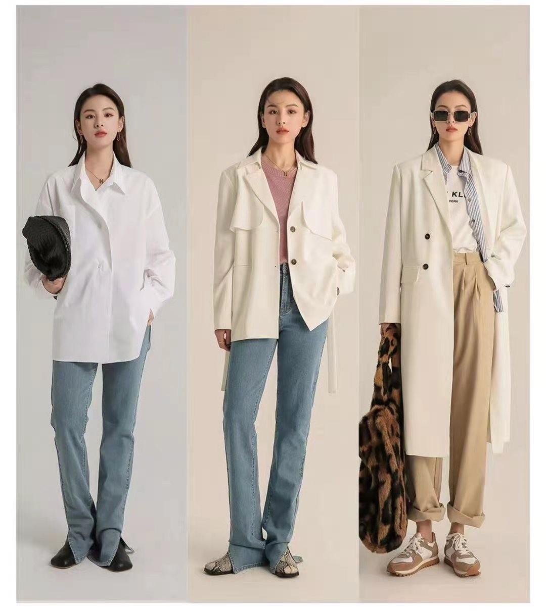 杏仁色夹克外套,利落剪裁突显服饰单品高级感,亦或是西服款大衣,大衣整体版型偏直筒。胯宽腿粗小肚腩的女孩,轻松遮住身材小缺点。