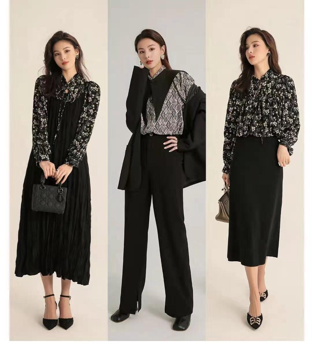 知性女性衣柜里必备的黑色怎么能忘记,碎花衬衫有两种穿法,搭配背带连衣裙甜美可人,搭配A字版型半身裙很显瘦显气质。职场女性建议高腰直筒裙,记得将衬衫衣摆扎进半身裙里,直筒款半身裙勾勒成熟女性曼妙身材,简约款式百搭又时尚,怎么搭都不出错。