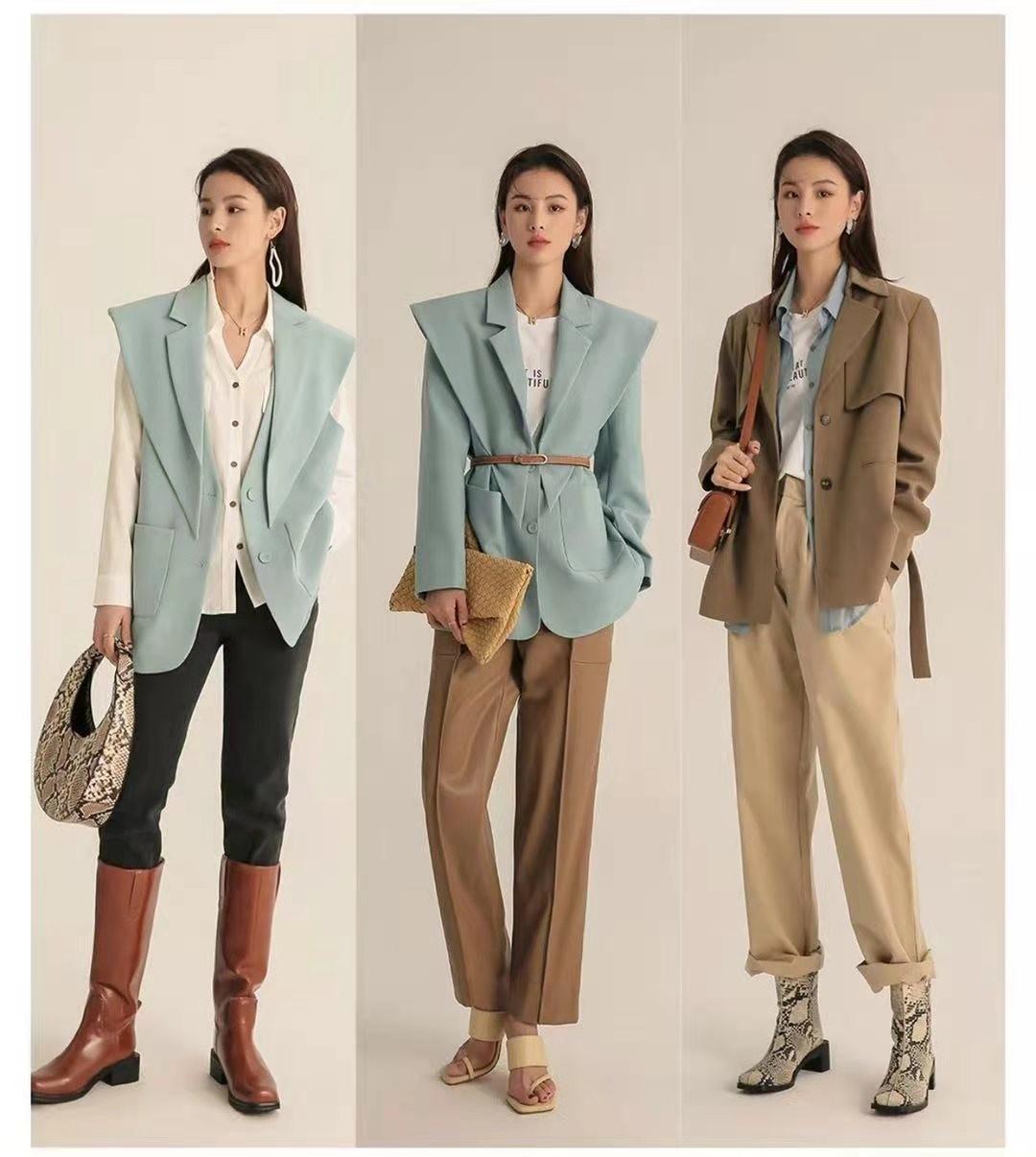薄荷绿西服外套实在是太显白,这款西服有两种穿法,一种是马甲外套,结构式垫肩设计提升层次感,独特设计感让人眼前一亮。腰间搭条腰带,显腰身显腿长,整体比例高挑,这两种穿法都值得尝试。喜欢叠穿法的试试第三款吧,薄荷绿衬衫让整体穿搭多了几分俏皮感。