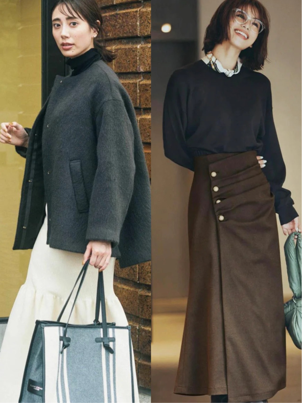 秋冬季节也别总是拒绝裙装,裙子在一年四季都是可以用来搭配的,像这些优雅的高腰半身裙配上毛衣或者是一件简单的外套,就能够让女人味展现出来。