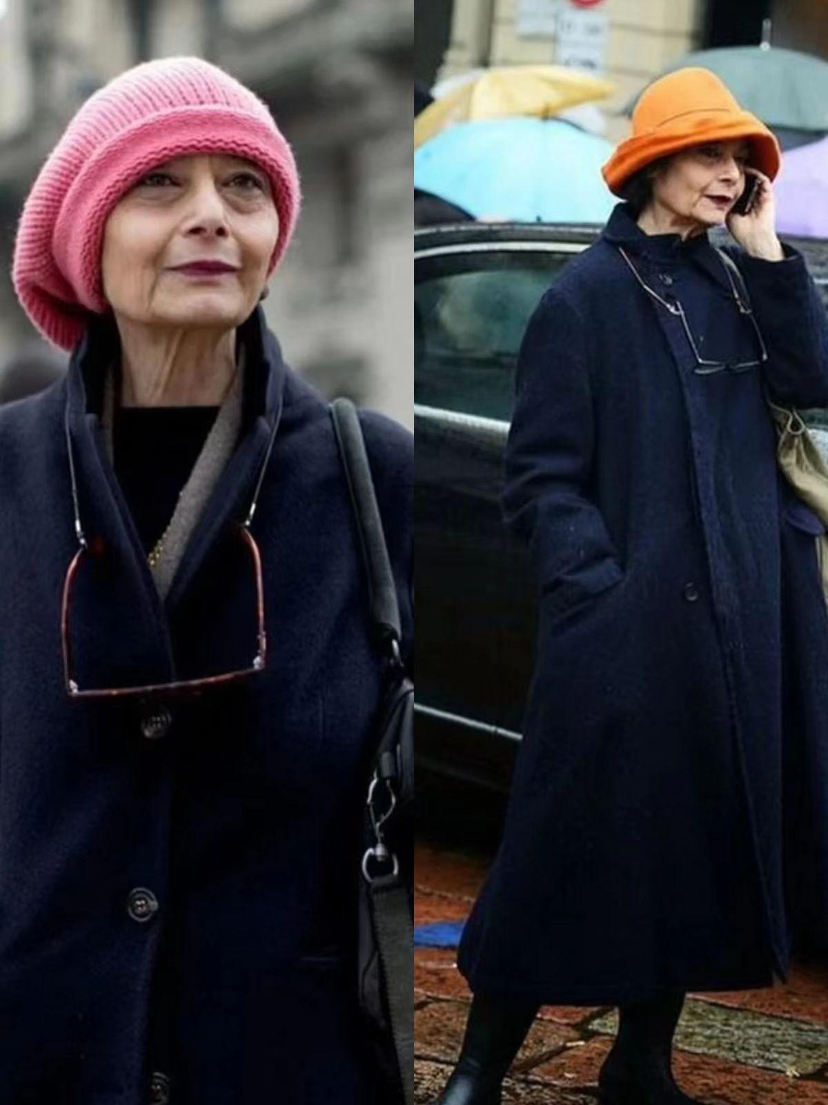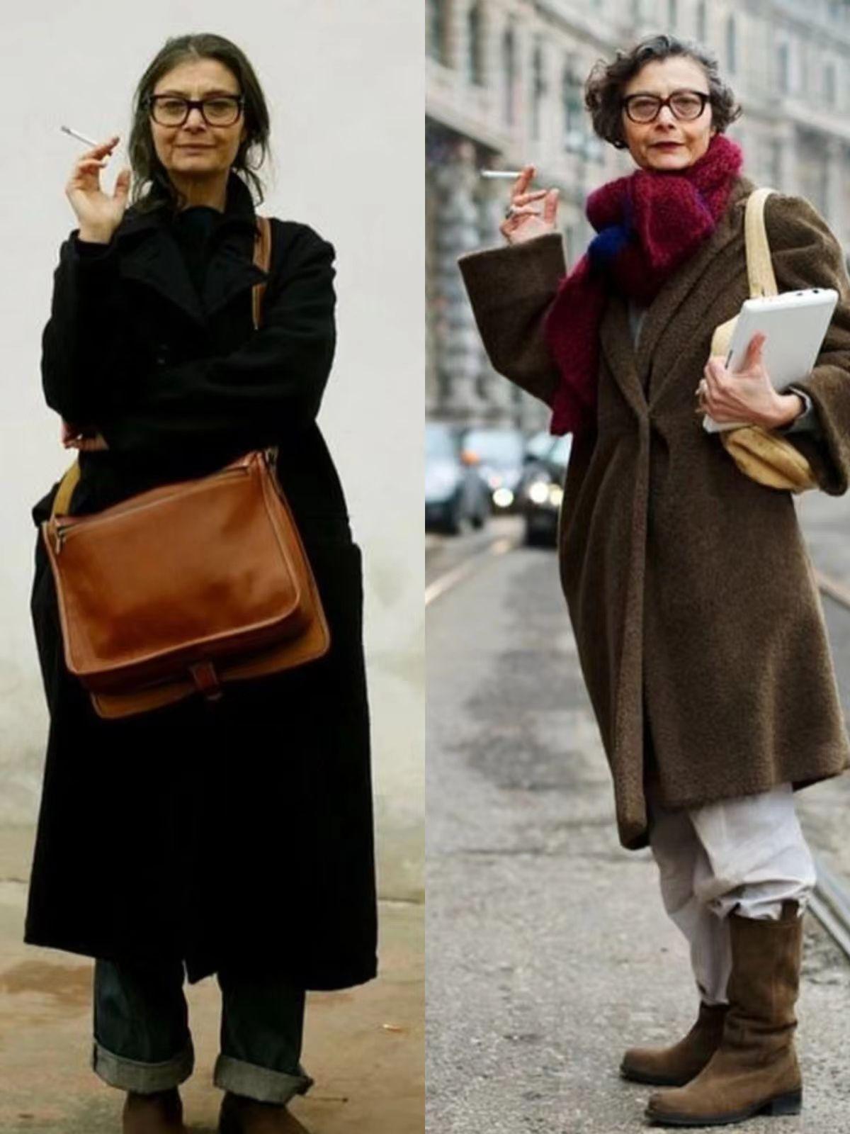 看看上面两位国外街头的奶奶,大衣穿长,搭配及膝裙、打底裤、方头鞋,或者搭配长筒靴,每一套都诠释了什么叫做风骨。