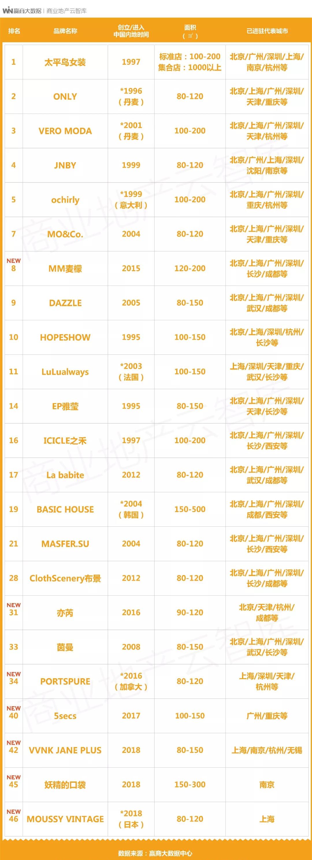 注:本榜单中带*年份为品牌进入中国内地时间,带有“NEW”表示品牌为近三年进驻中国内地购物中心的新兴品牌(下同)