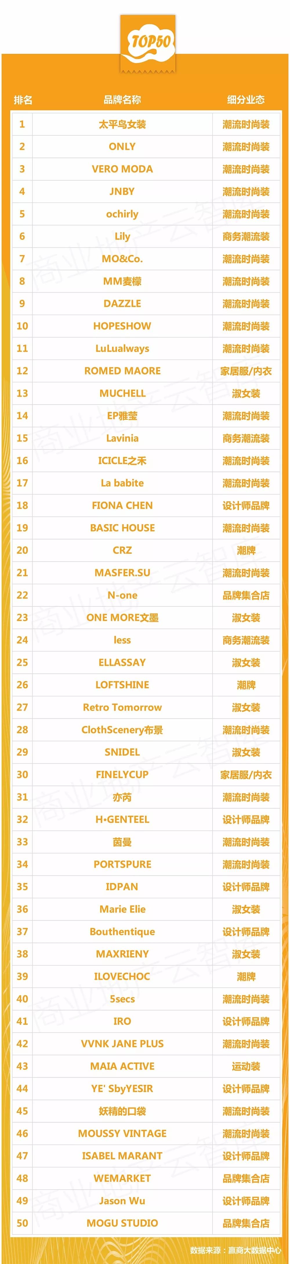一、年度购物中心关注女装品牌榜TOP50