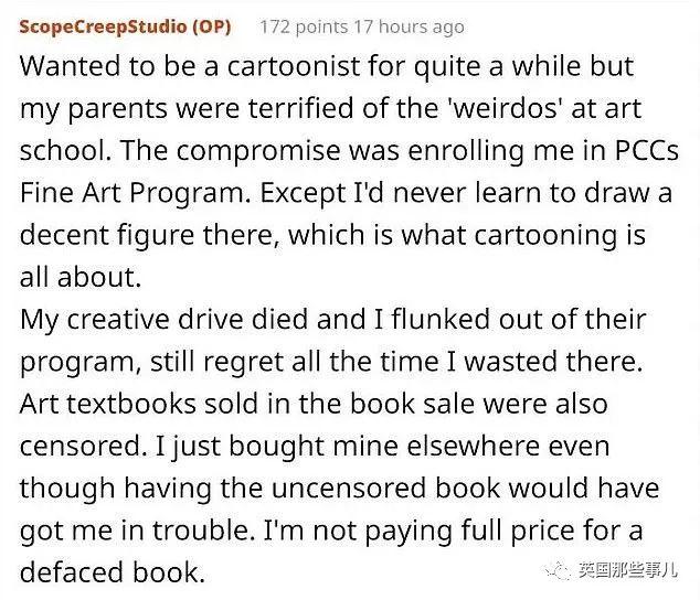 “一直以来,我都想成为一名卡通创作者。但是,保守的父母总担心那些艺术学校的‘怪孩子’会把我给带坏了。”