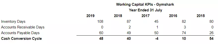 在保持高毛利率的同时,GymShark还始终保持着健康的运营现金流,2019财年的现金流营业利润率为6%左右,这意味着公司每100美元的销售额,就会分拆6美元的营业现金流。资料显示,GymShark的现金转换周期 ( CCC ) 在2019财年达到了48天,GymShark的平均持有库存108天,并用60天结算供应商。