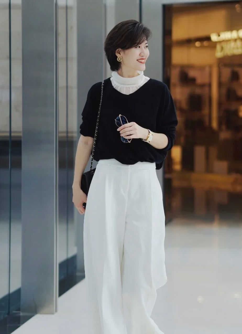 在日常生活当中,基础色的服装单品出镜率是高的,不仅驾驭起来容易,而且还很抬气质。建议大家在选择基础色的时候,可以避免一身黑或者一身白的造型,像这种经典百搭的黑白配,才能够轻松地穿出高级感。30%的黑色+70%的白色,既拿捏住了深浅分明的关系,又很好地塑造了平衡状态。