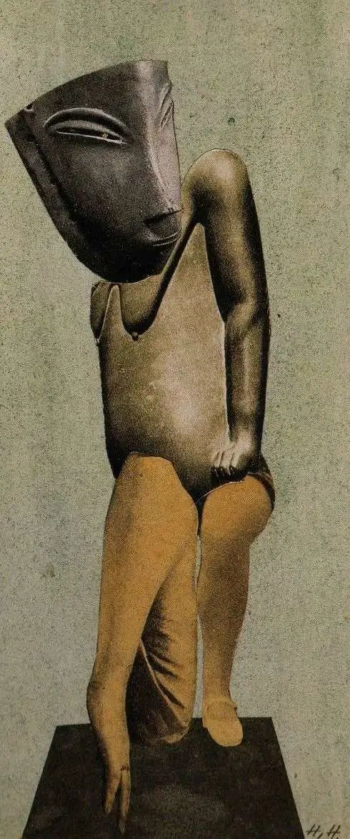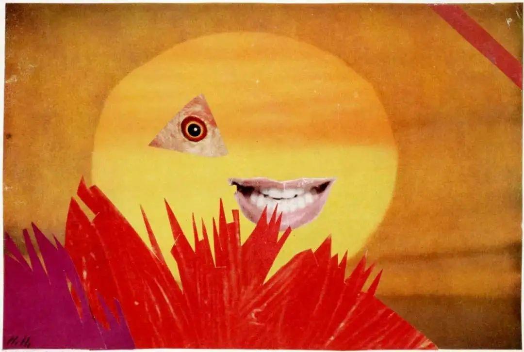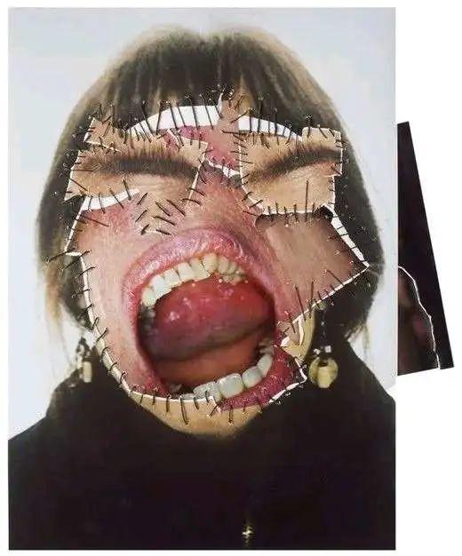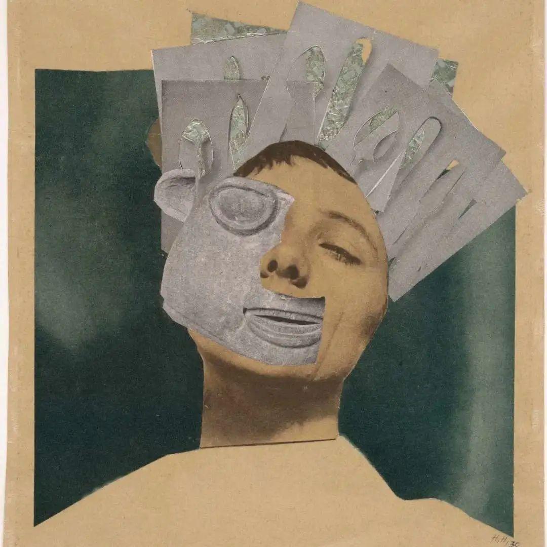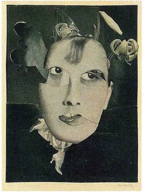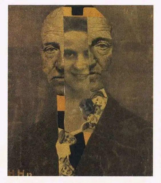 这是一张引起不适,但令人印象深刻的拼贴,技术手法值得借鉴,装饰性很强,右侧出框的的叠加,黑色而立体,与肖像的服装同色,这人内心黑暗,外观丑陋,有眉无眼