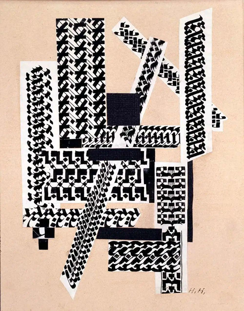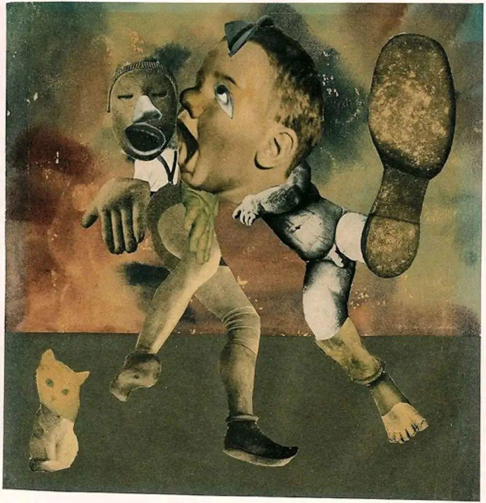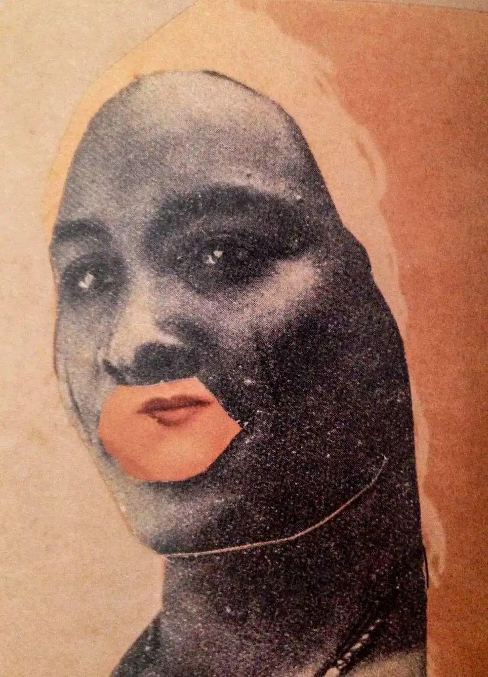 这是一张引起不适,但令人印象深刻的拼贴,技术手法值得借鉴,装饰性很强,右侧出框的的叠加,黑色而立体,与肖像的服装同色,这人内心黑暗,外观丑陋,有眉无眼