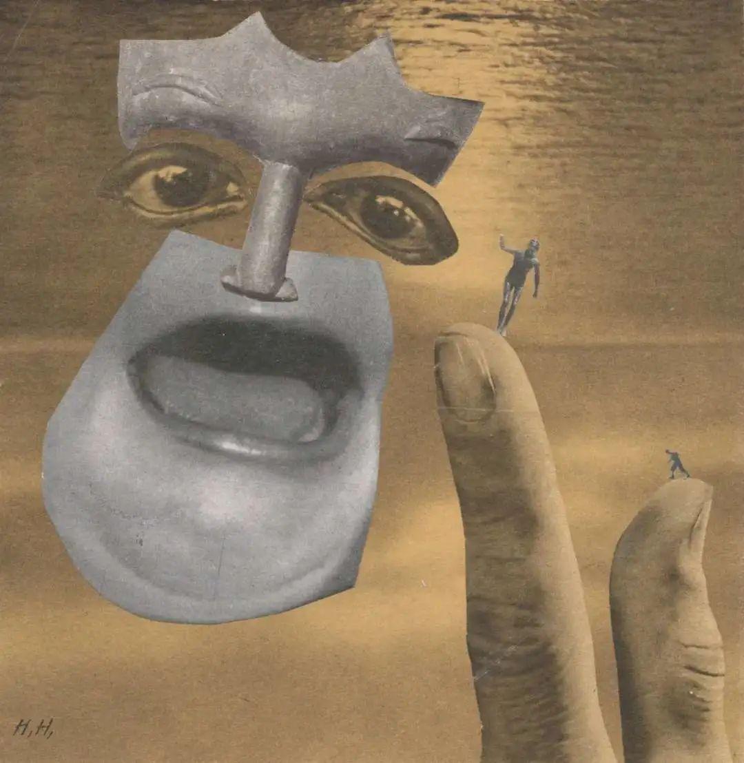 这手的控制,脸的拼贴。简洁的图像而指向明晚。